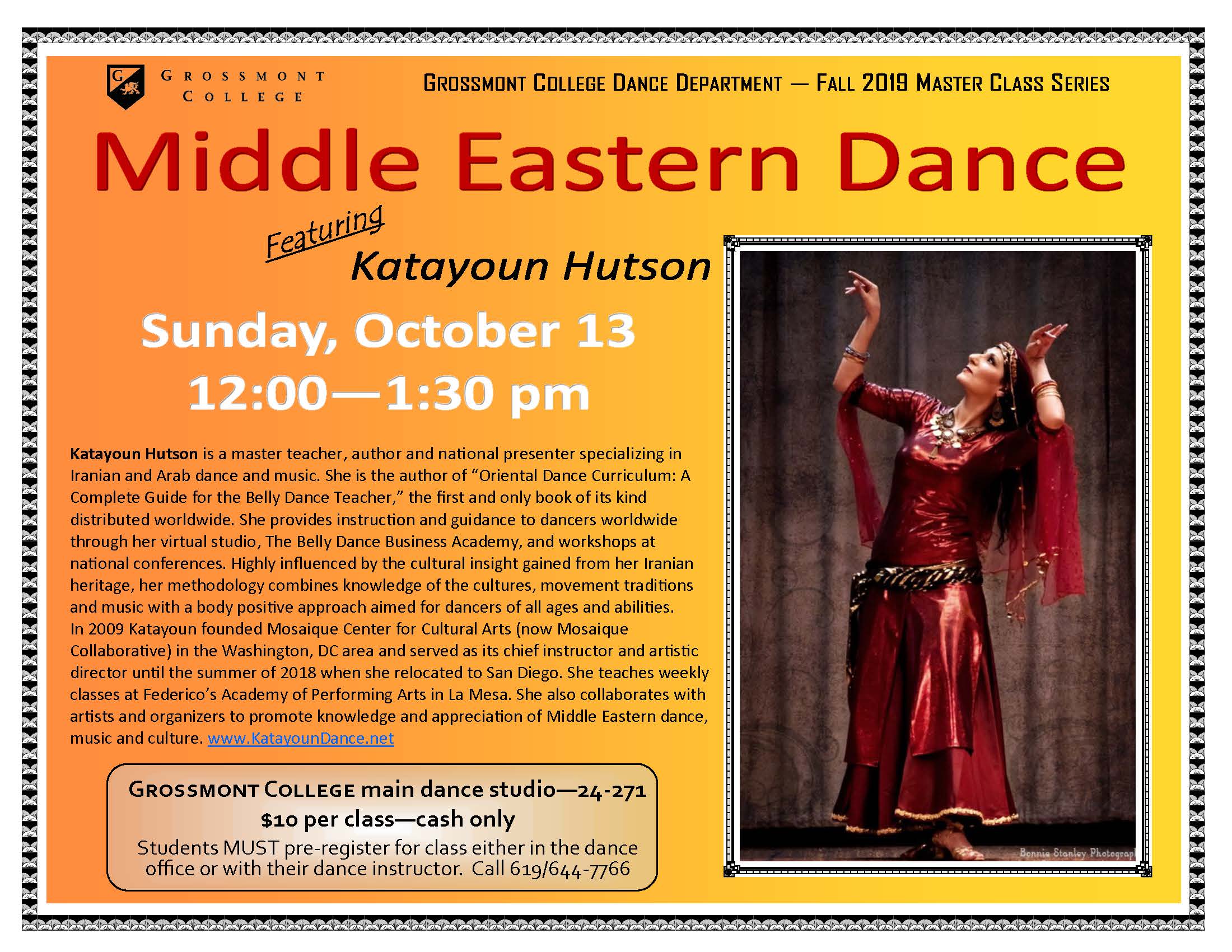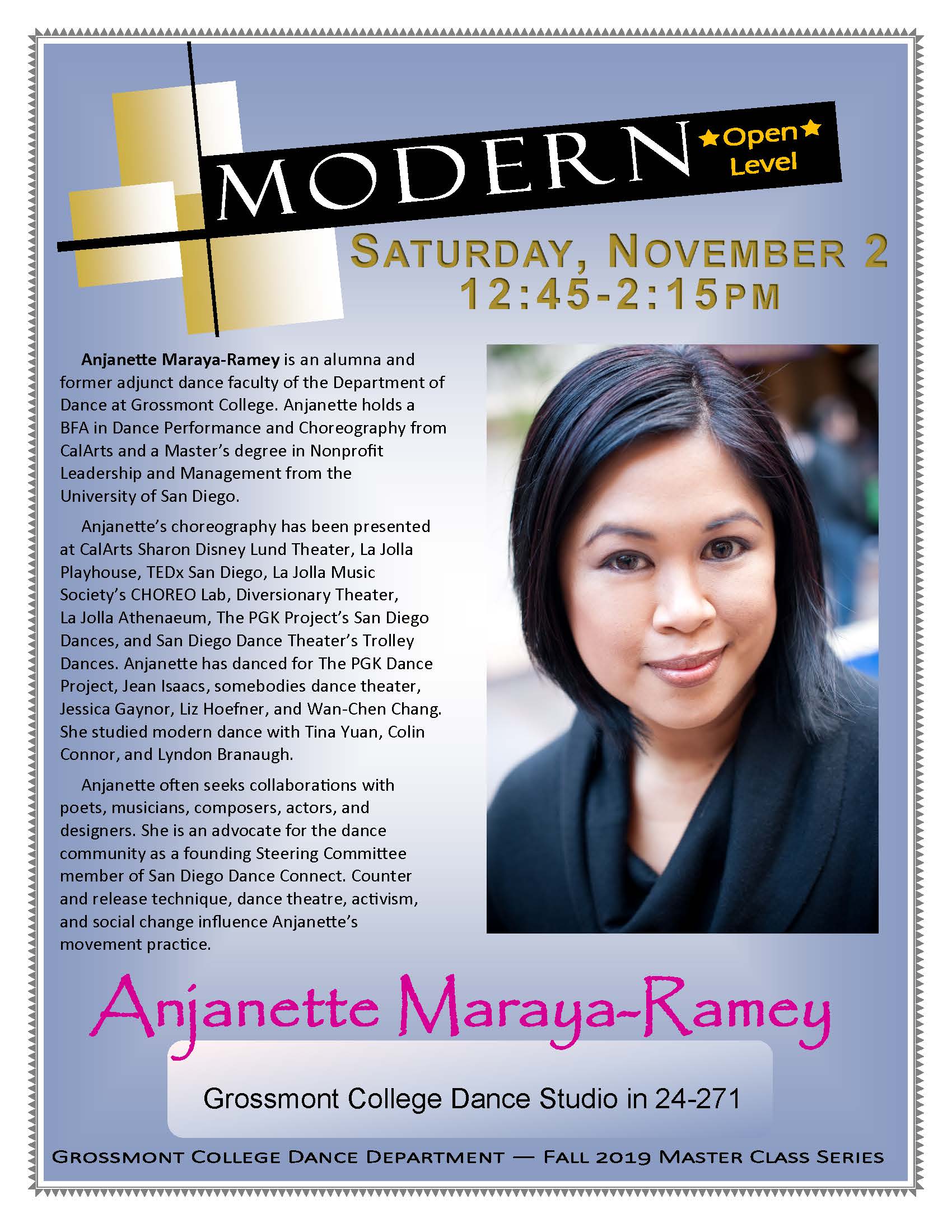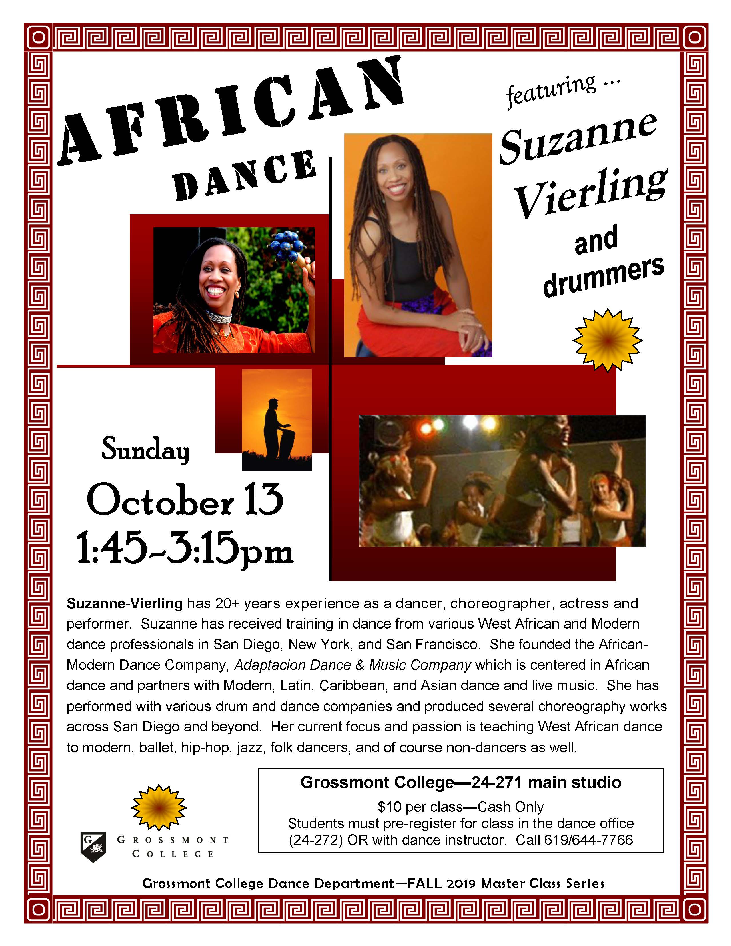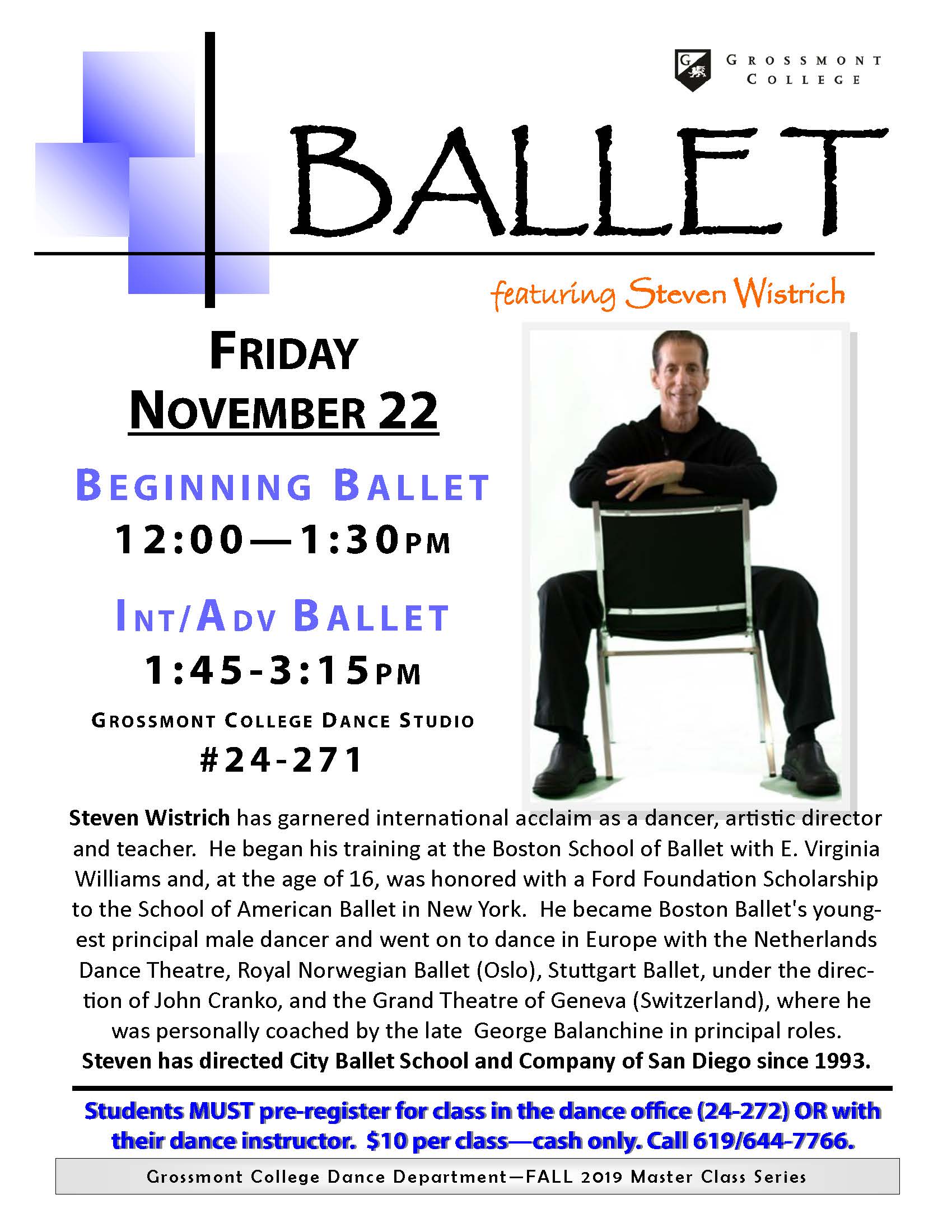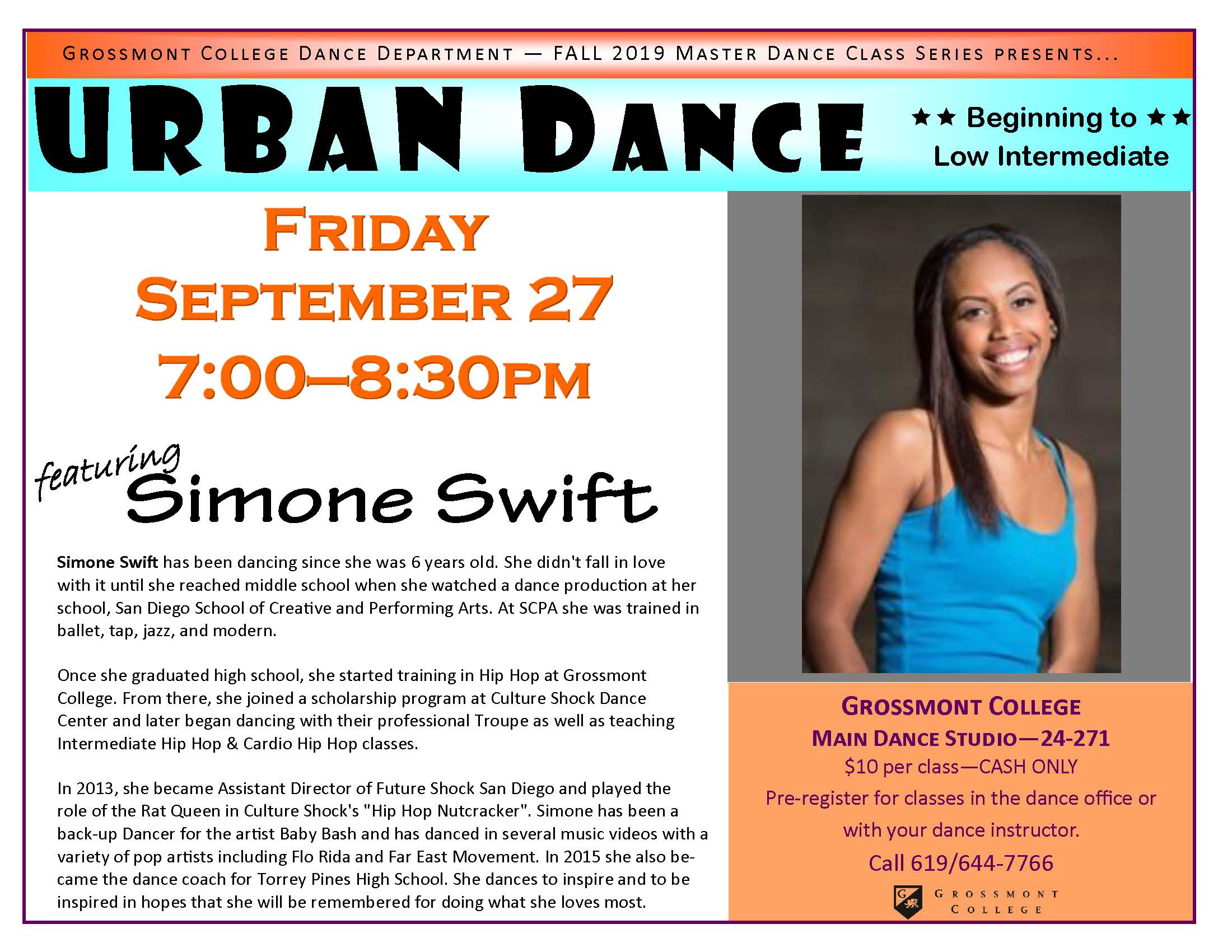 The Grossmont College Dance Department is excited to announce the FALL 2019 Master Class Series. Below are the master class dates, genres, and times. Preregistration is required. Call 619/644-7766. Master classes are held in the Grossmont College main dance studio (24-271) unless otherwise stated.
