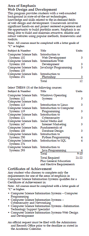 This program provides students with a well-rounded background in state-of-of-the-art technologies,knowledge and skills related to the in-demand fields of web design and development. Coursework involves significant hands-on and project centered experienceand the opportunity to build portfolio assets. Emphasis is on being able to build and maintain attractive, reliable and robust websites using popular methods, frameworks and toolkits.