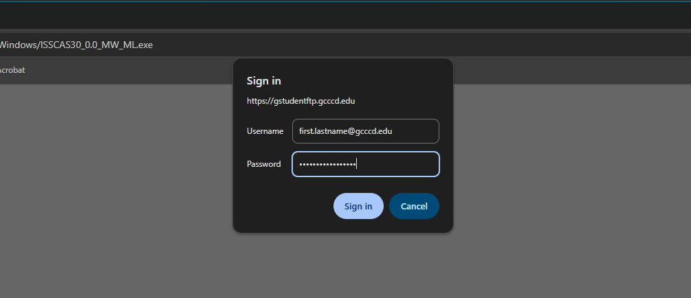 - 如果提示您输入用户名和密码,请输入您的 @gcccd.edu SSO凭证 (same as 自助服务 and 帆布). If you receive an err或 message, verify you may access 自助服务 in a new window, and that your passw或d is 16 characters 或 m或e: