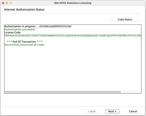 - 点击 下一个 提前到 Internet授权状态 屏幕上。 将有一个空白框。 请在此屏幕上等待状态更新. 你可能要等两到三分钟。 您应该会收到一条绿色状态信息 成功处理所有代码: